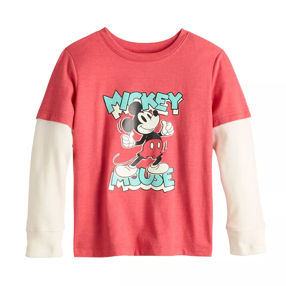 Refresh his cool weather wardrobe with this boys’ faux layered sleeve Mickey Mouse graphic skater tee from Jumping Beans. ©Disney